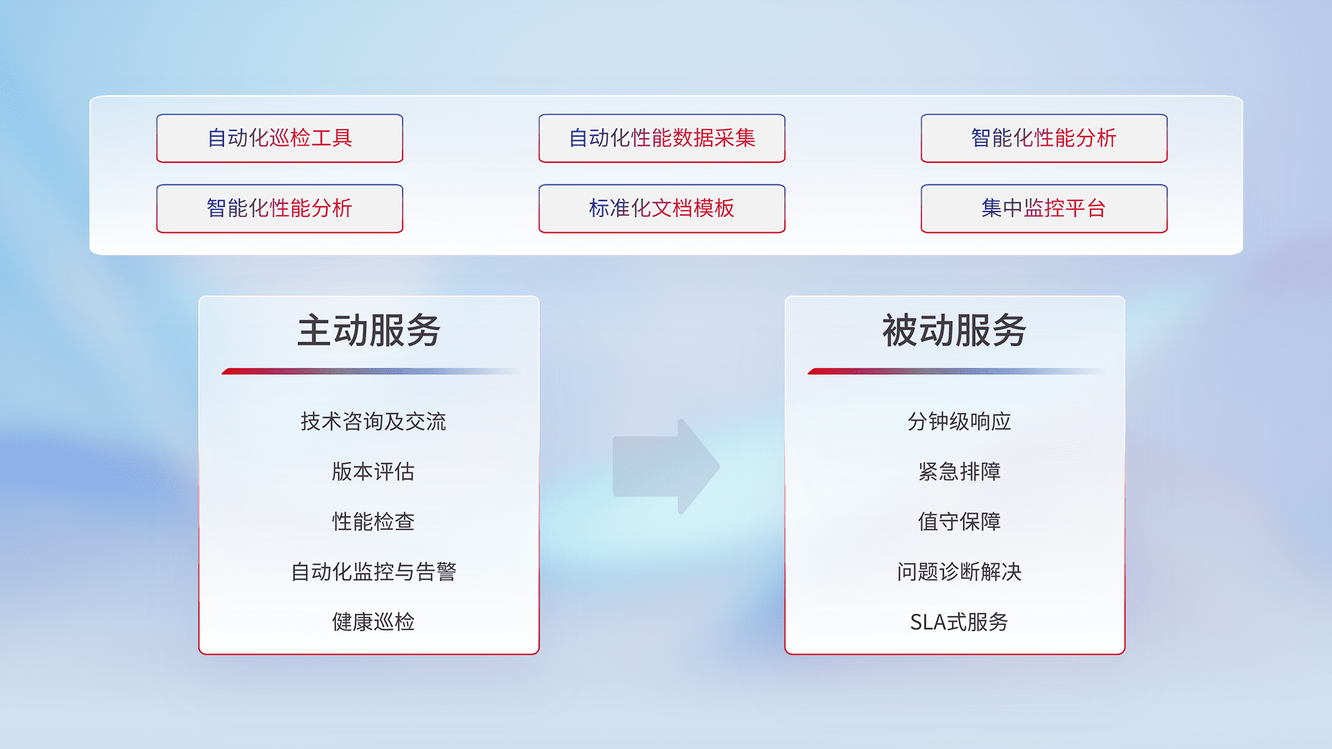 智能化工具和标准化文档,,保障服务质量,,提供主动服务(包含技术咨询、、、、版本评估、、、、性能检查、、自动化监控与告警、、健康巡检)和被动服务包含(分钟级响应、、、紧急排障、、值守保障、、、、问题诊断解决、、、、SLA服务)。。。