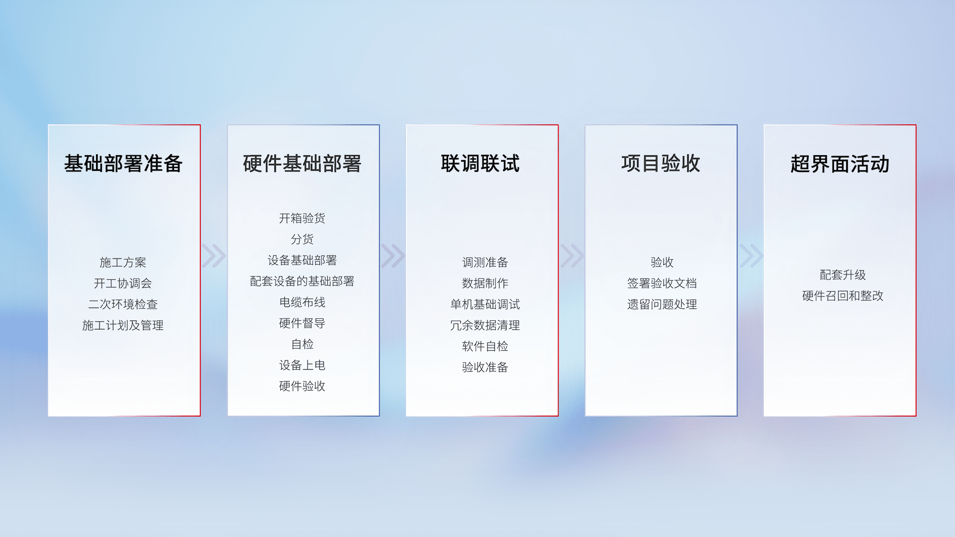 从基础部署准备、、、硬件基础部署、、、联调联试、、、、项目验收、、、越界面活动的全过程可追溯,,,保证施工质量和进度。。